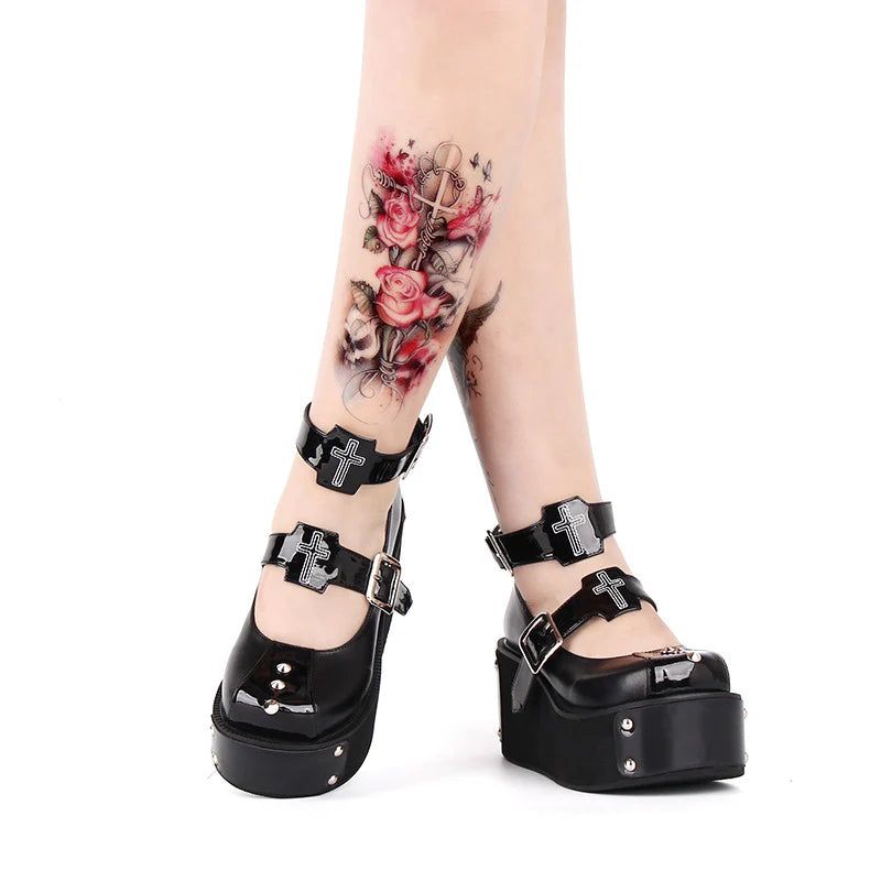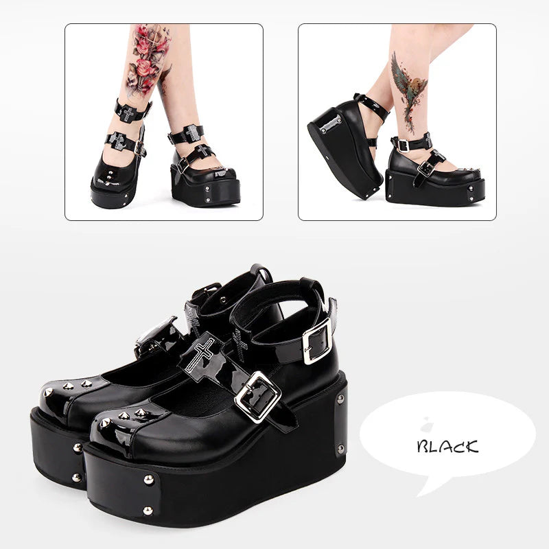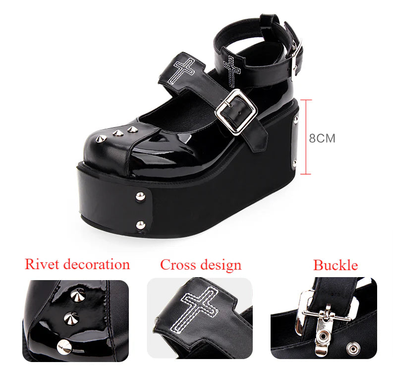 Features: Round-toe, platform handmade shoes with rivet decoration. These shoes can be a good choice for Gothic Lolita coordinate as well as punk Lolita coordinate, or even daily shoes that match daily Kuro Lolita. It has two options black shining and black matte. We also accept custom color making, just contact us if you want a custom color.