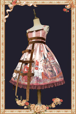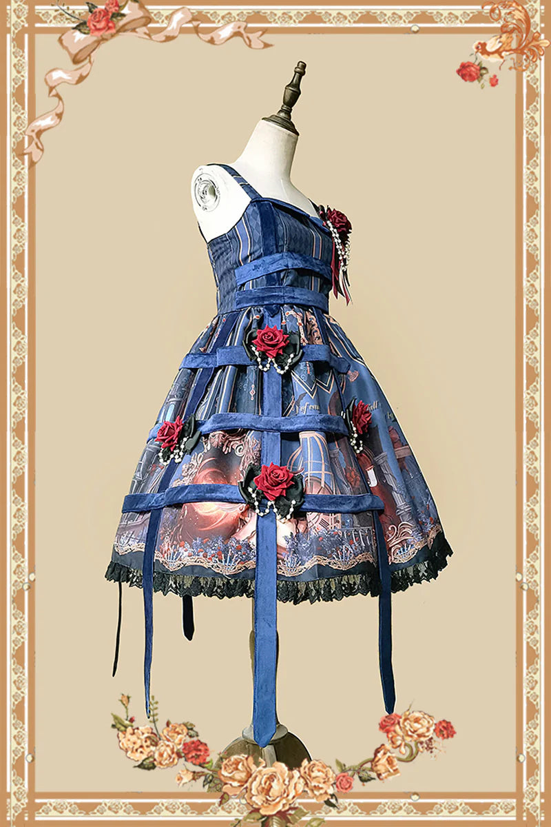 Features: This is a gothic Lolita-style JSK dress. Shirring back. The dress has a beautiful print. The overall color is mysterious and dark.