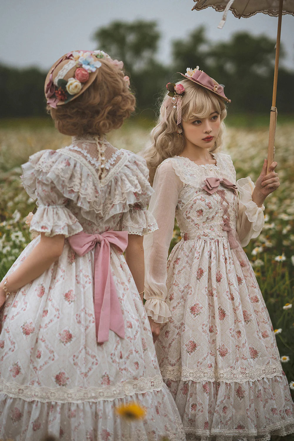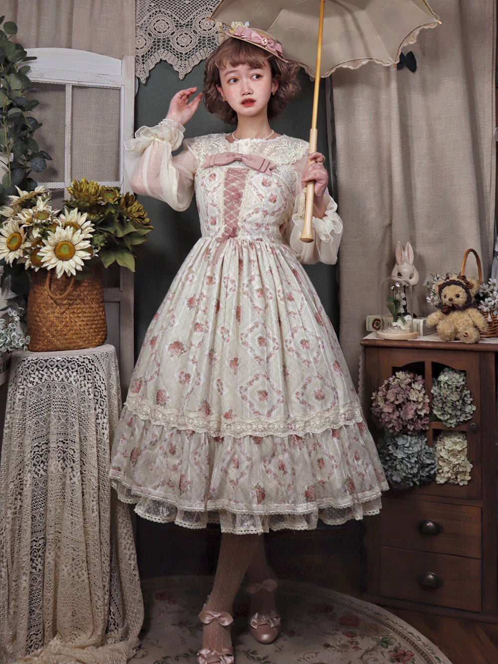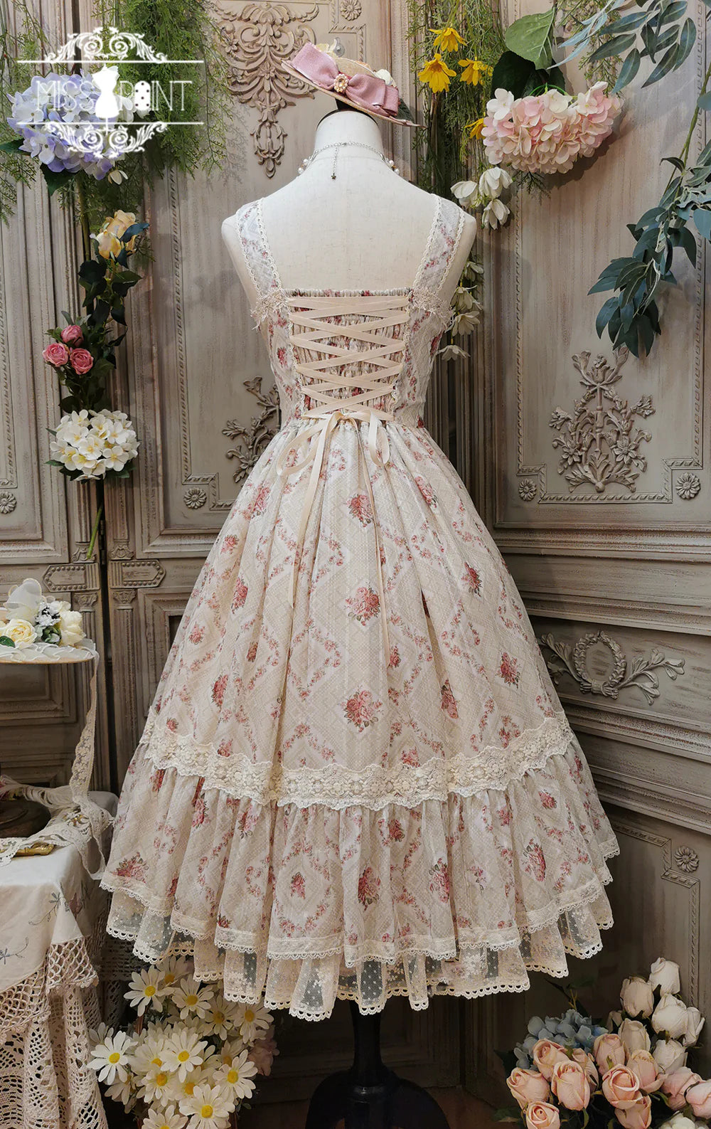 Features: This floral Lolita jumper dress features full of floral print, lace-up front, and lace shoulder. There is a waist tie that can modify your waist better.