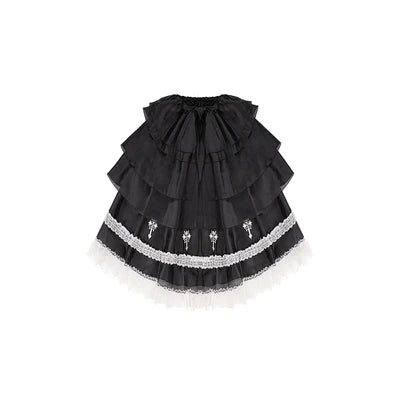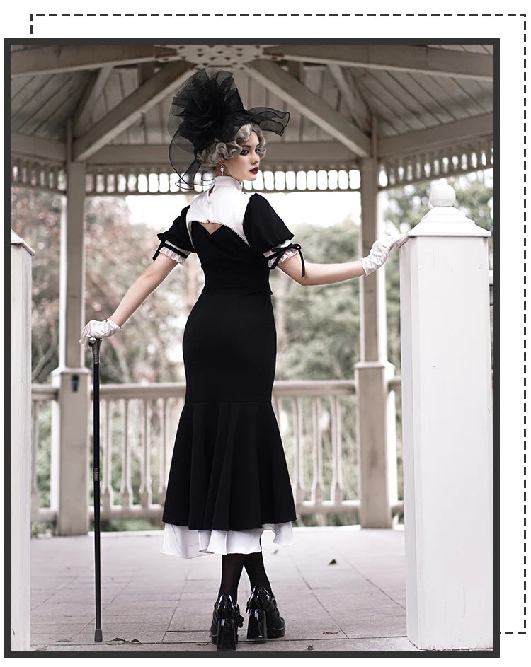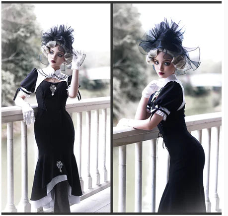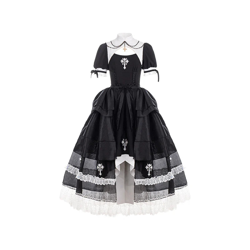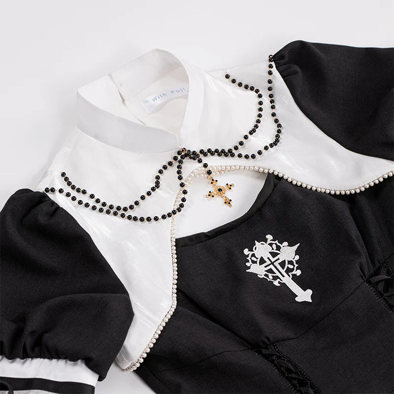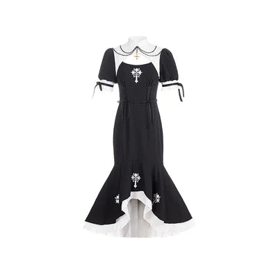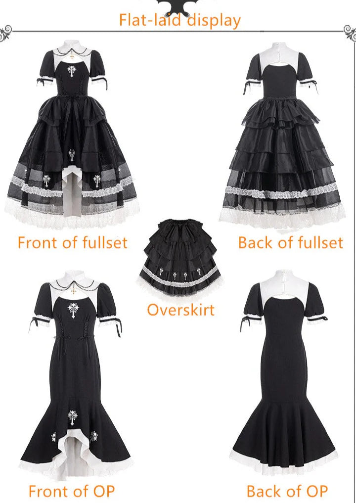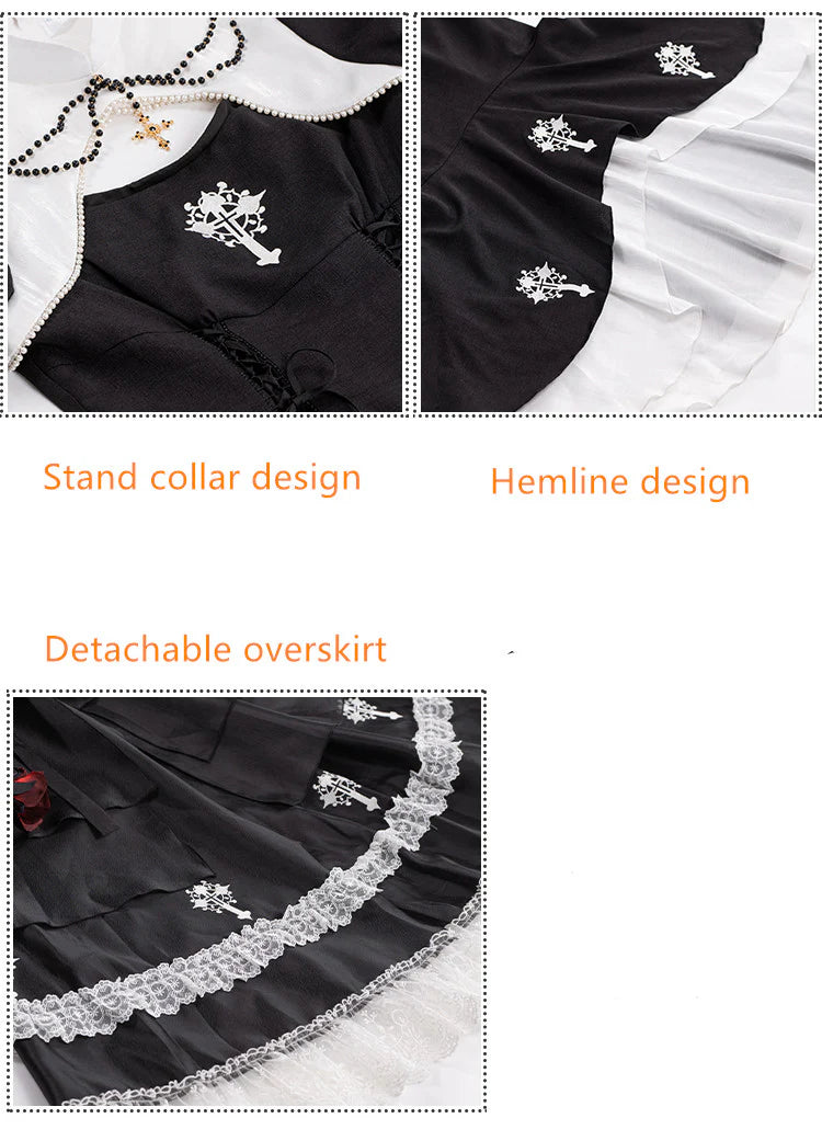 Features: It is a Gothic nun Lolita style one-piece dress from Letter and Poem series. It features embroidered cross at chest and dress bottom, crossover strap at waist, stand collar, pearl decoration in neck, mermaid hemline, detachable overskirt. The corset lacing design shows your figure perfectly. A really good choice for EGL fashion lovers.