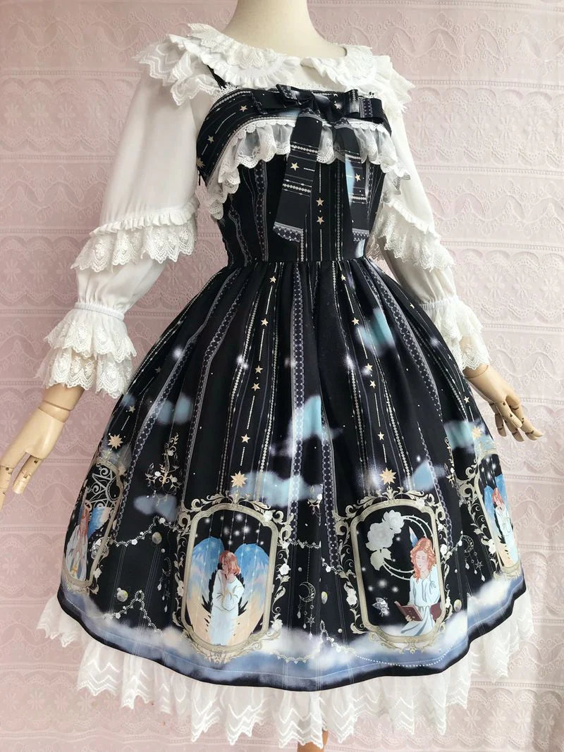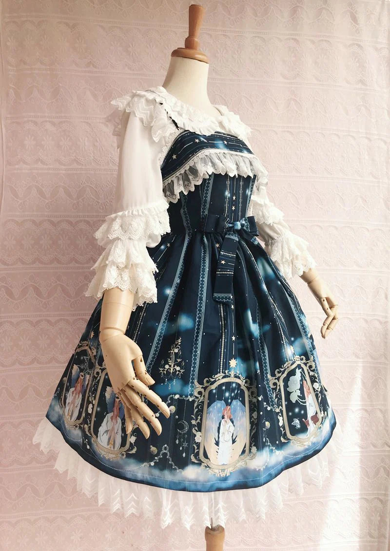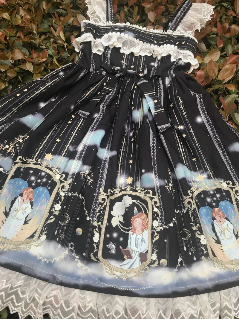 Features: It is an original designed JSK dress with lovely Lolita style. This Lolita JSK features lace flounce at the chest, large bowknot at the waist. The skirt is printed with angel-themed patterns such as angels, stars and moon, along with lace flounce. It’s lovely and cute.